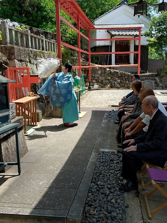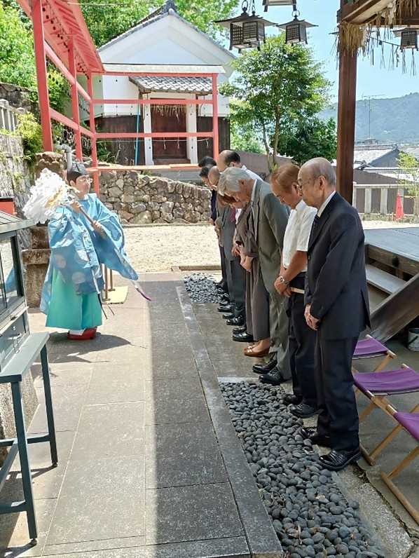 2025年6月29日(日)令和7年度 田植え奉告祭が新宮神社にて厳かに執り行われました。 令和7年6月29日(日)午前11時~松ヶ崎の氏神さん新宮神社にて松ヶ崎水利組合、水役の主催で恒例の田植え奉告祭が執り行われました。本年は例年より20日ほど早く梅雨明けとなり、本年も早くから猛暑日が予想されております。 松ヶ崎自治連合会他、関係者が参列し、本年も豊作、また水災の無い年でありますよう祈願いたしました。 田植え奉告祭 風景