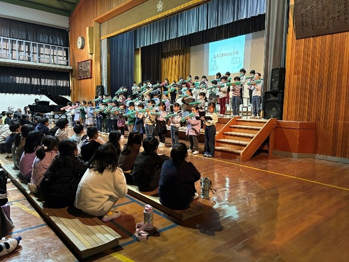 本年度は全校児童と保護者が一緒に観覧し、保護者席は自分の子の学年が参観しやすいように入替え制となりました。